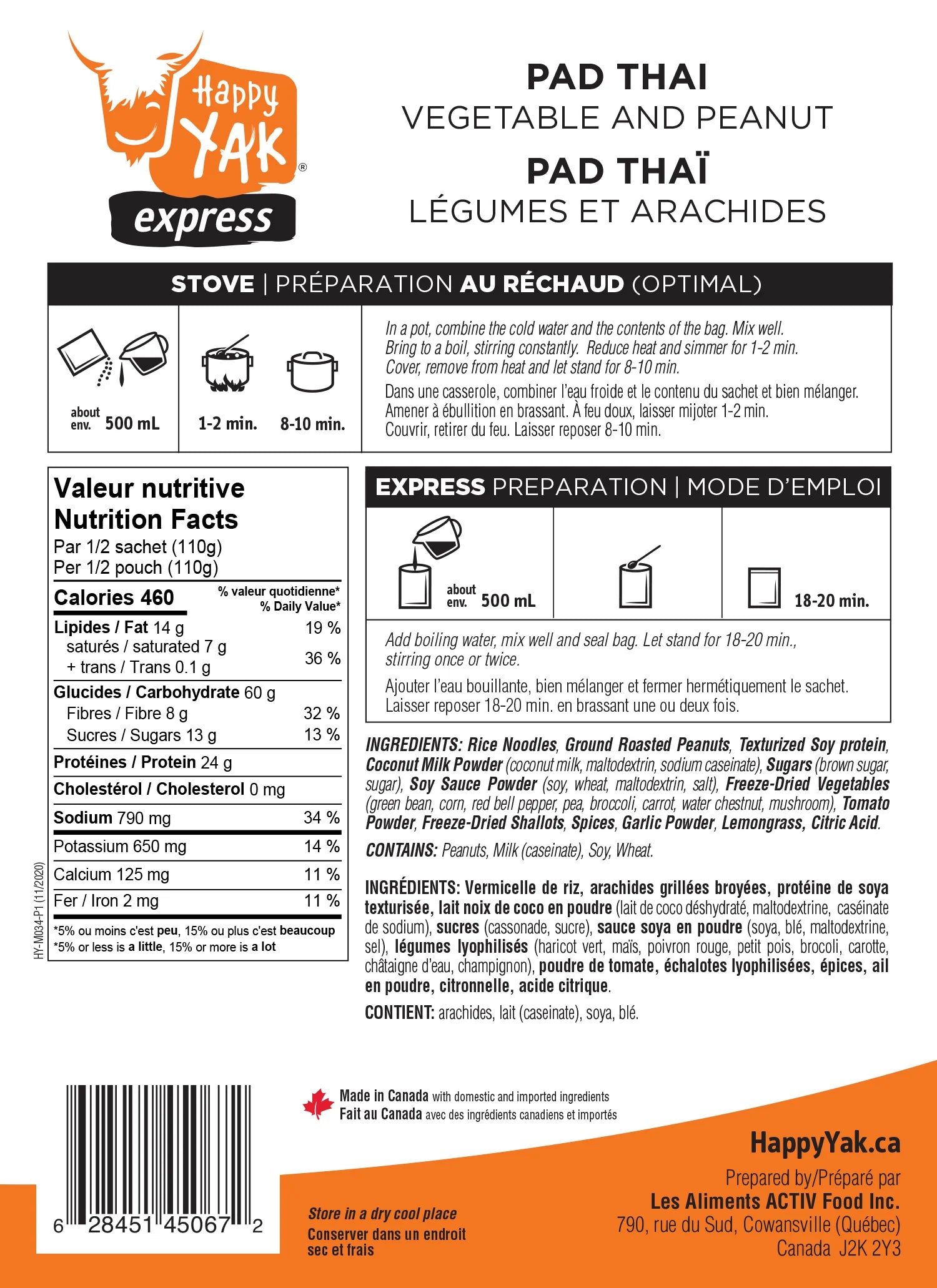 Looking for a restaurant quality Pad Thaï on the go? Happy Yak has formulated a delicious express Pad Thaï that is vegetarian, lactose-free that is less than 1% gluten. This large portion will impress you with its 48 g protein and 920 calories. That explains why, Happy Yak's Pad Thaï is the number 1 choice of many of our clients.