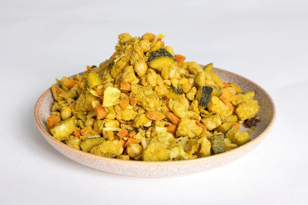 Chickpeas, Tempeh, Zucchini, Whole Wheat Couscous, Carrots, Tomatoes, Cabbage, Onion, Raisins, Canola Oil, Sea Salt, Spices, Dehydrated Garlic.