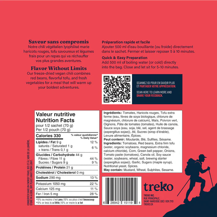 Inspired by Caroline Côté's feat when she broke the world record at the South Pole, this meatless chili has everything you need to warm up after a big day outside. Fresh tomatoes, red beans, golden corn and extra firm tofu, freeze dried together to keep all the colors and flavors.