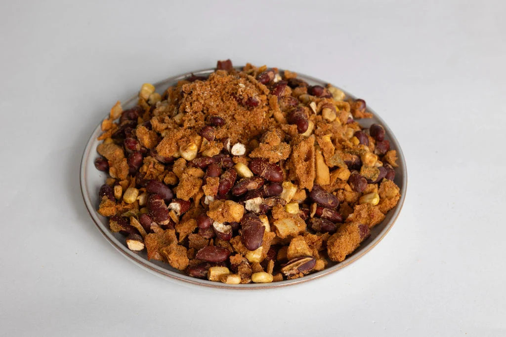 Red beans, Extra firm tofu, Corn, Green pepper, Onions, Tomato paste, Canola oil, Tamari sauce, Garlic, Maple syrup, Nutritional yeast, Spices